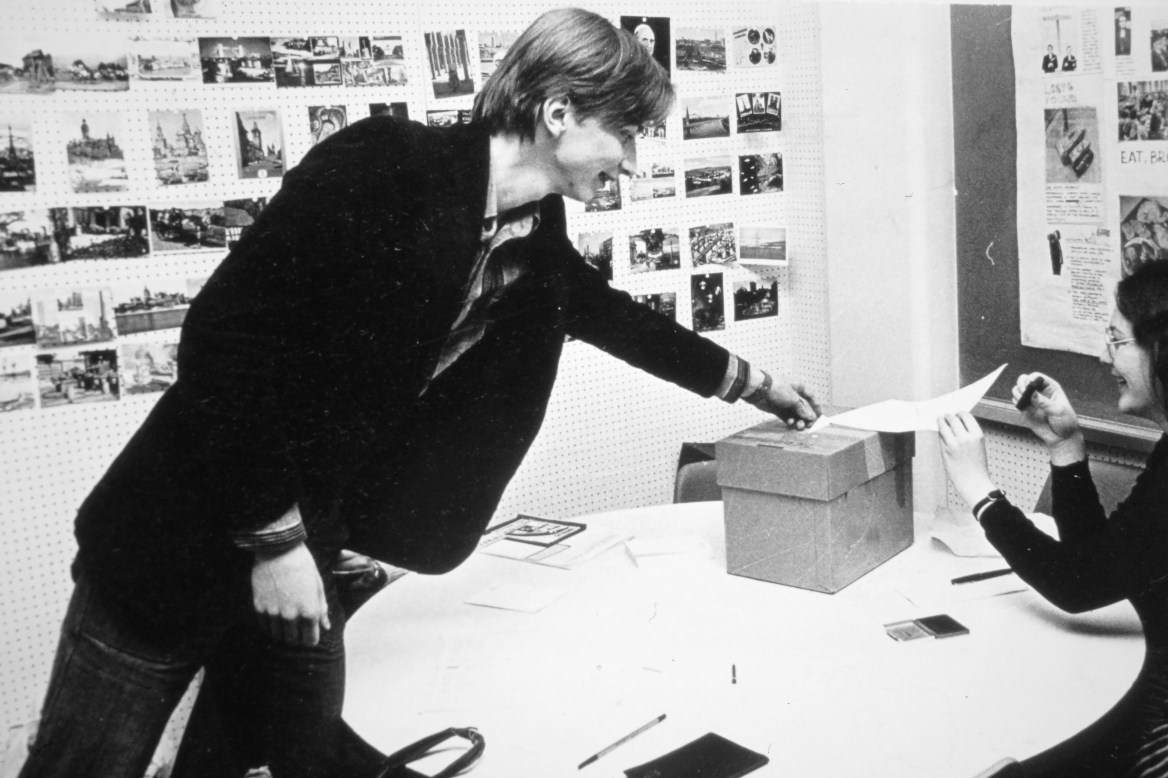 Tiedotusopin opiskelija, sittemmin elokuvaohjaajana mainetta niittänyt Aki Kaurismäki antaa äänensä yliopiston vaaleissa.
