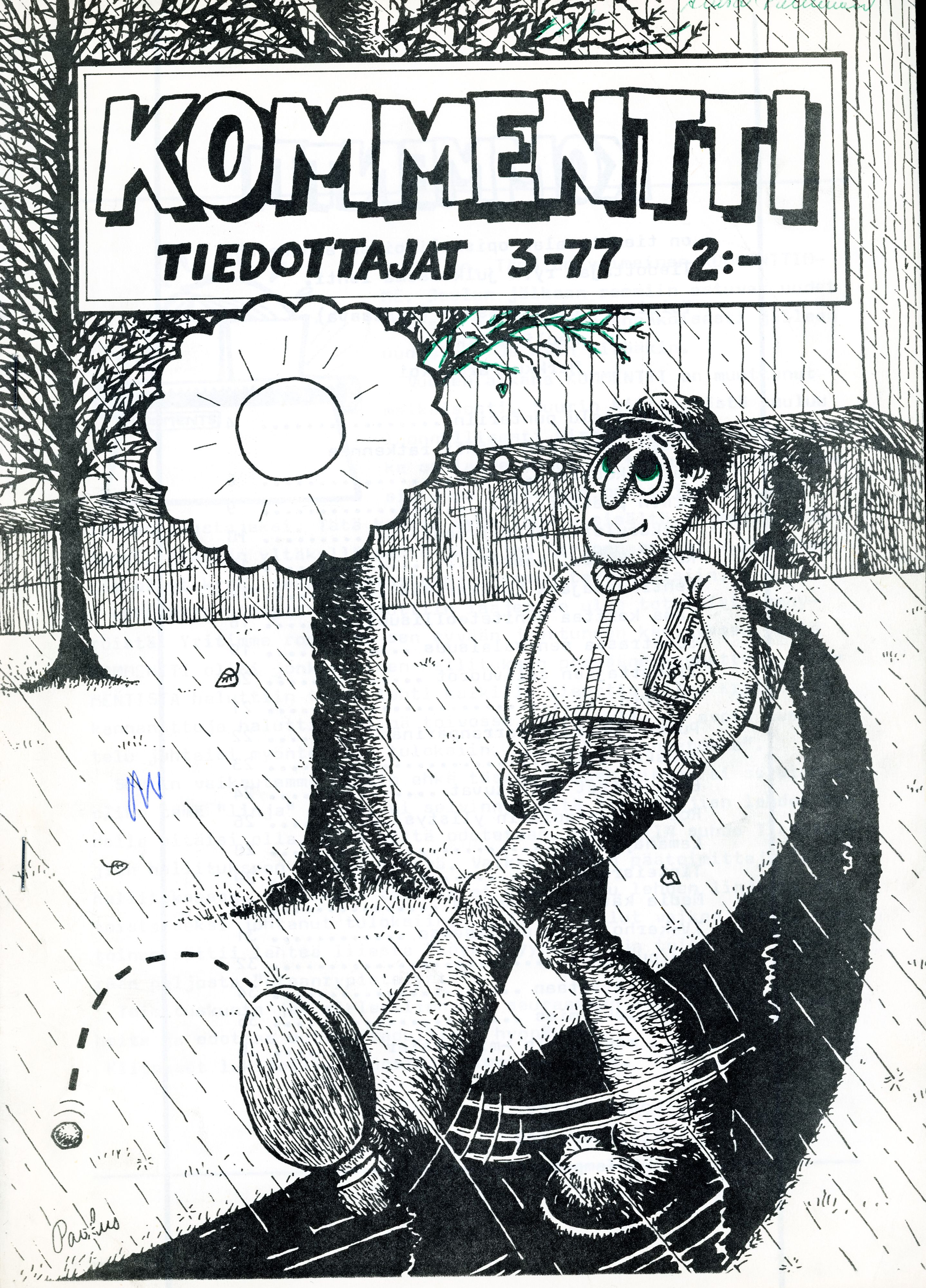 Yllä on kuvajournalismin professori Hannu Vanhasen Kommentti-lehti vuodelta 1977. Kannen piirsi Pahkasika-lehdessäkin vaikuttanut Pauli Heikkilä.