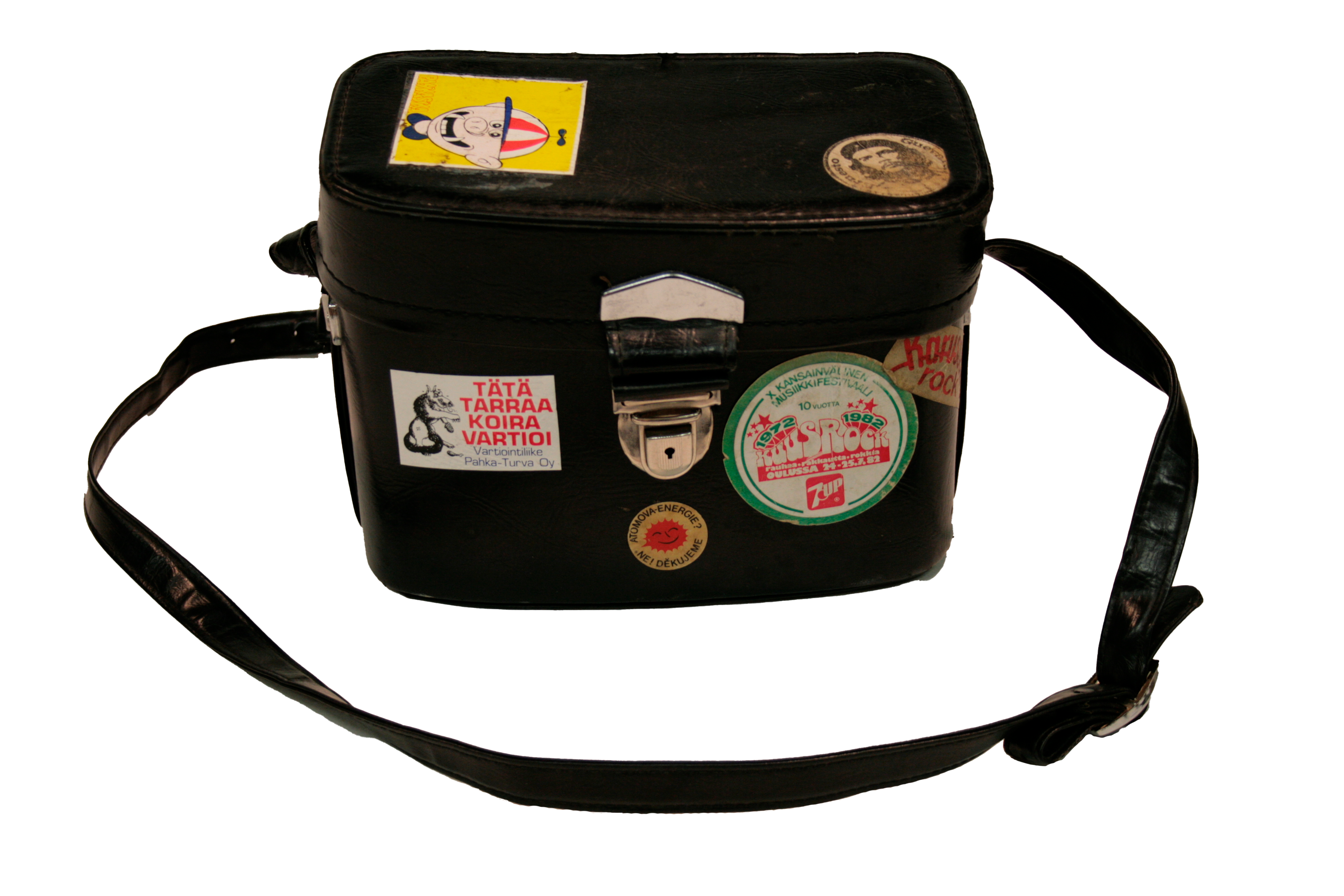Työväenmuseo Werstaan esinearkistosta löytyy viereinen nahkalaukku nimeltään "Tiedotusopin opiskelijan laukku".