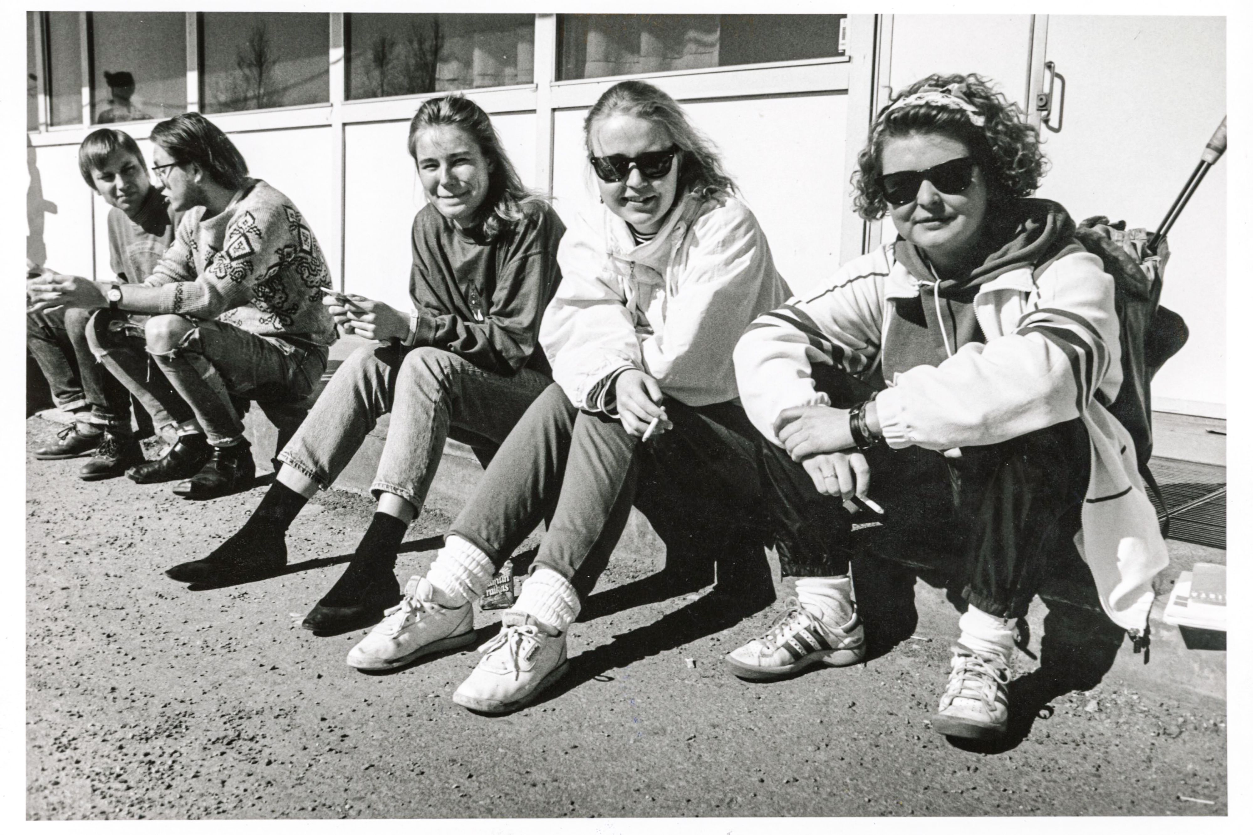 Opiskelijoita röökitauolla harkkarin edustan auringossa vuonna 1991. Kuvassa toinen vasemmalta Jari Arffman, Kati Toivonen, Piia Laita ja Paula Pohjamo.