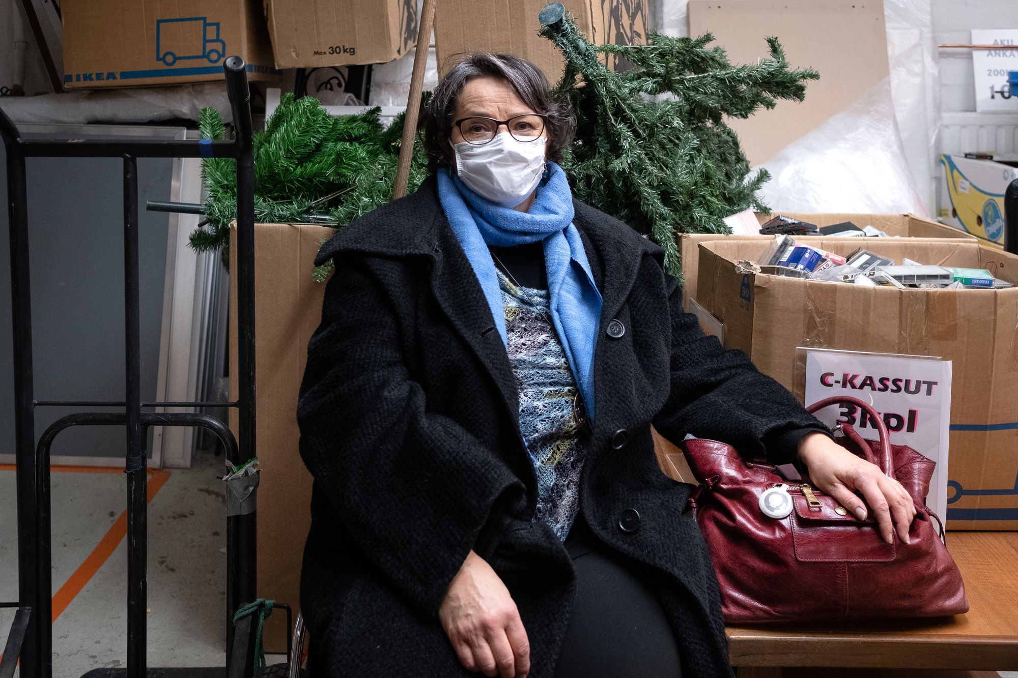 Paula, 57, odottaa ostosreissun jälkeen miestään kirpputori Kodin Kakkosen ovilla. Paula käy paljon kirpputoreilla, koska käytetyn tavaran ostaminen on eettistä.