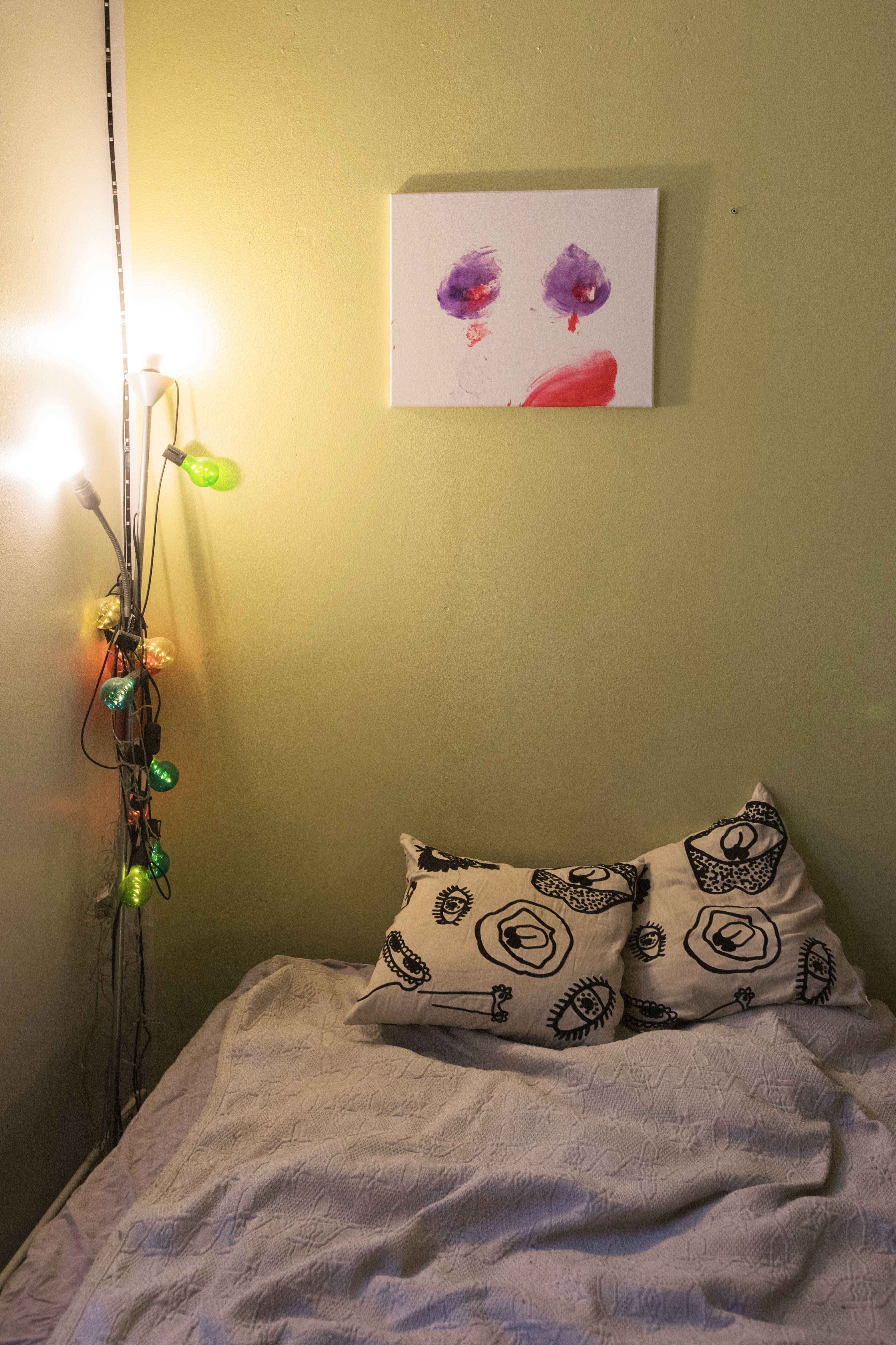 Hän istuu yksiönsä sängyllä. Asunnosta löytyy useampi peniksen muotoinen koriste, on kynttilää ja pullonavaajaa. Seinällä on keholla maalattu tissitaulu. Kirjahyllystä löytyy useita seksi- ja erotiikka-alan merkkiteoksia.