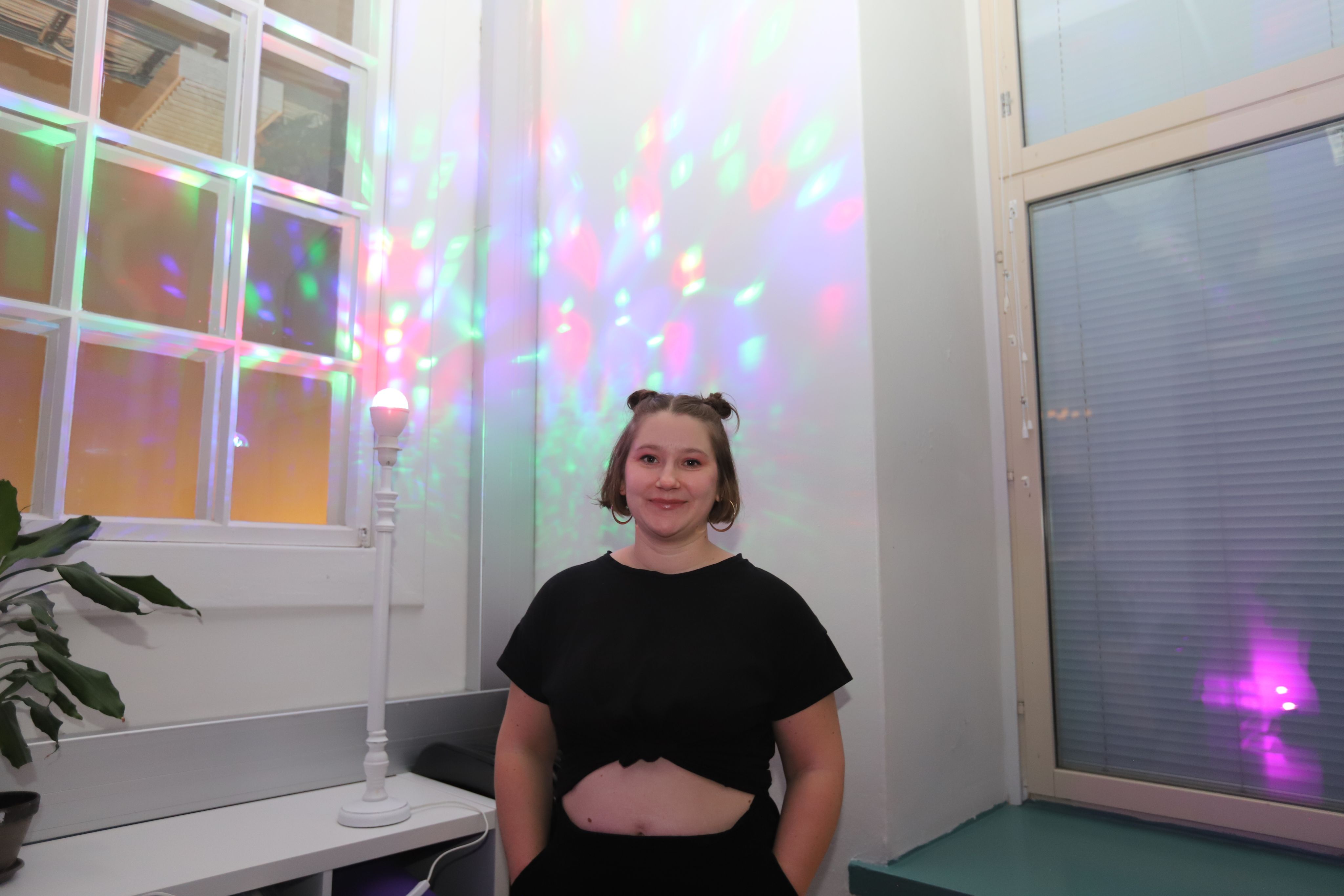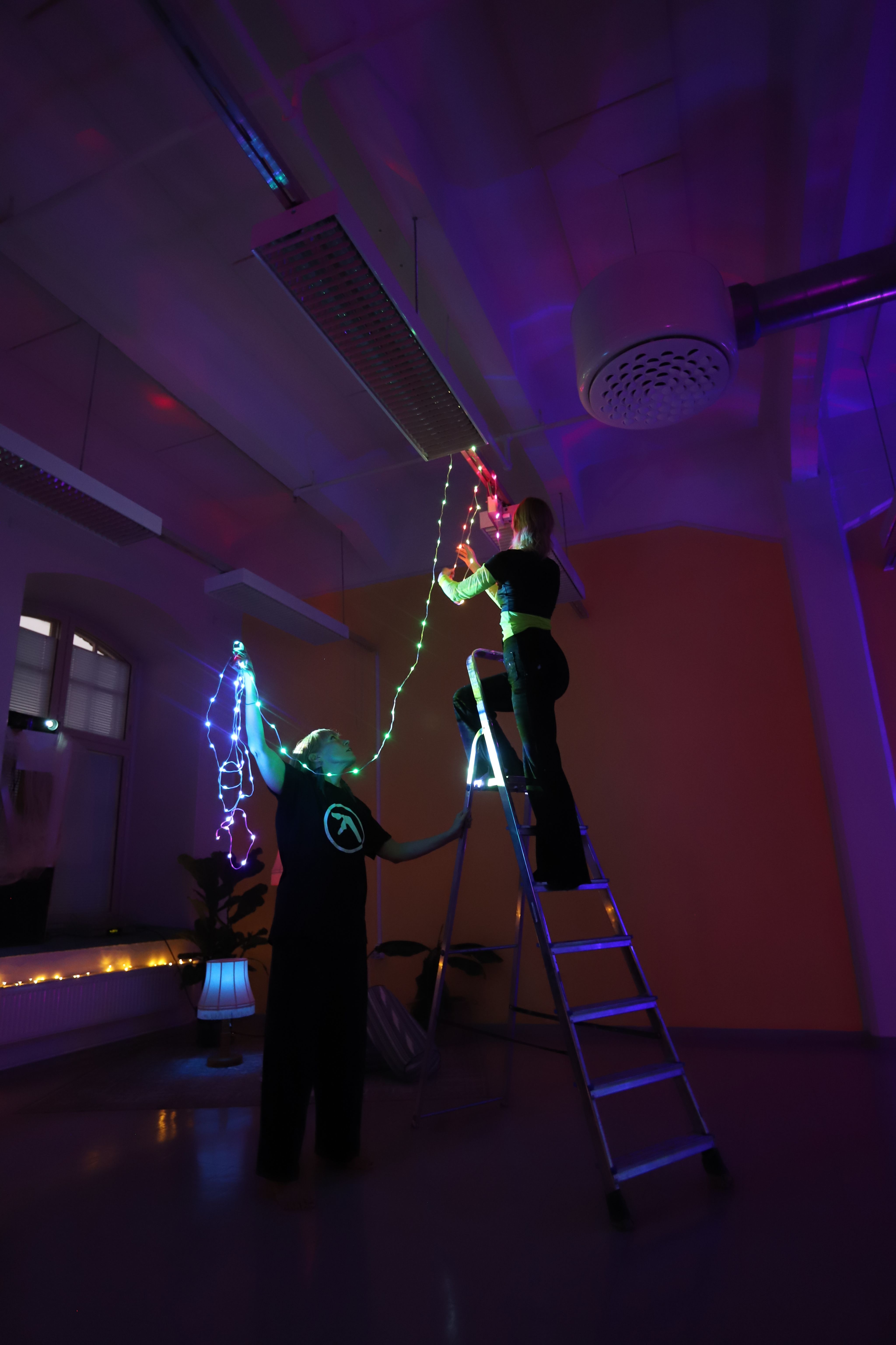 Värikkäitä harsoja ripustetaan roikkumaan lampuista. Vaikka studiolla järjestetään reivejä ensimmäistä kertaa, ei voi olla huomaamatta, että monipuolisten tapahtumien järjestäminen on tälle porukalle tuttua. Tilan laittaminen näyttää tapahtuvan luontevasti, vaikka välillä koristeiden solmuja tuskaillaan ääneen. Reiveissä on kyse vain kahden tunnin tapahtumasta, mutta panostuksesta ei ole puutetta.