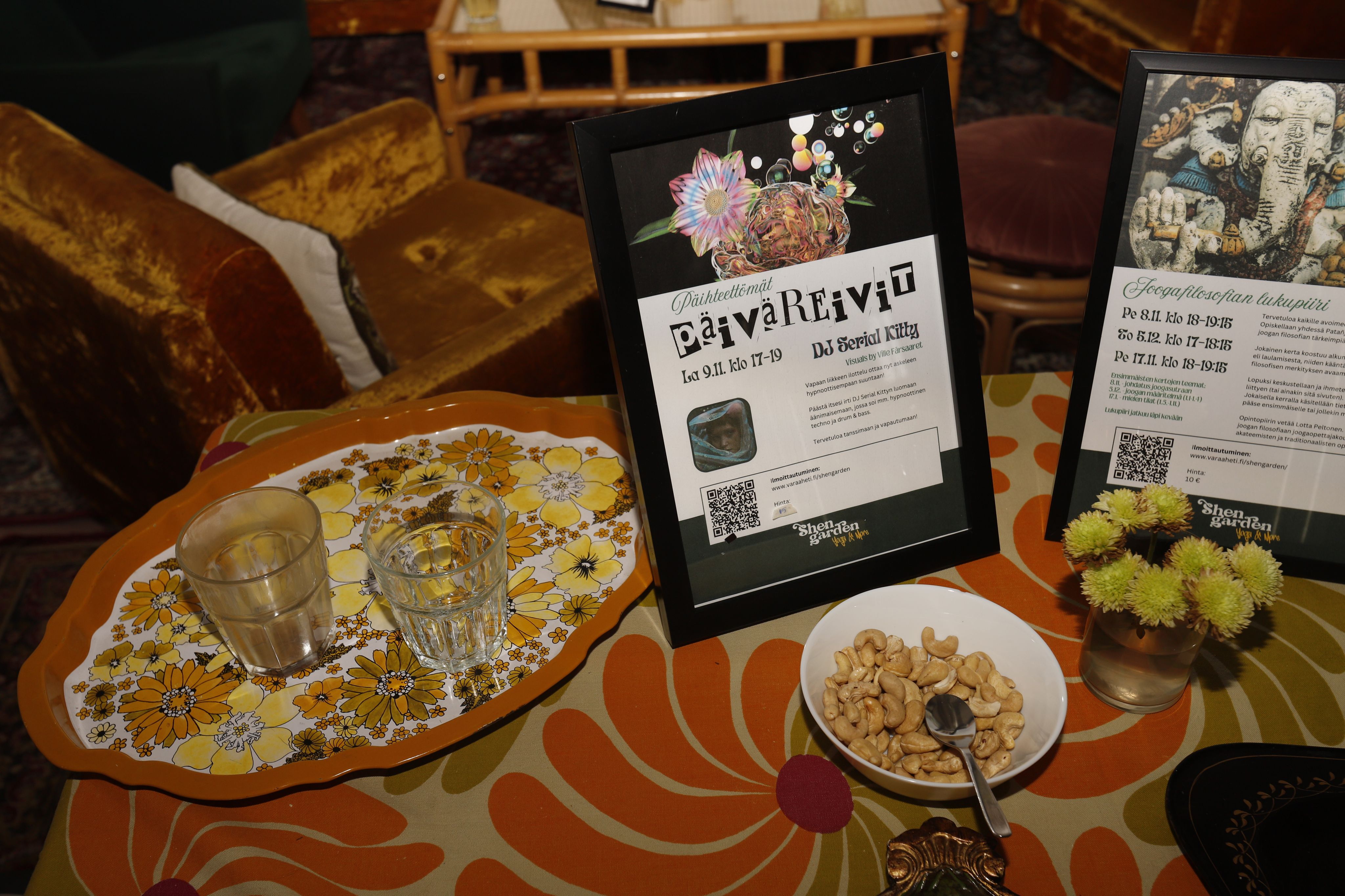 Tapahtumassa on mukana Dj Serial Kitty, oikealta nimeltään Minni Välipakka. Välipakka on soittanut musiikkia myös Shen Gardenin avajaisissa. Seinälle heijastetaan VHS-laitteilla luotua videotaidetta, joka on Ville Färsaarten käsialaa. Heillä on joogastudiolla yhteinen työhuone, joten paikka on ennestään tuttu. Yritykselle on tärkeää yhteistyö tilan nuorten taiteilijoiden kanssa.