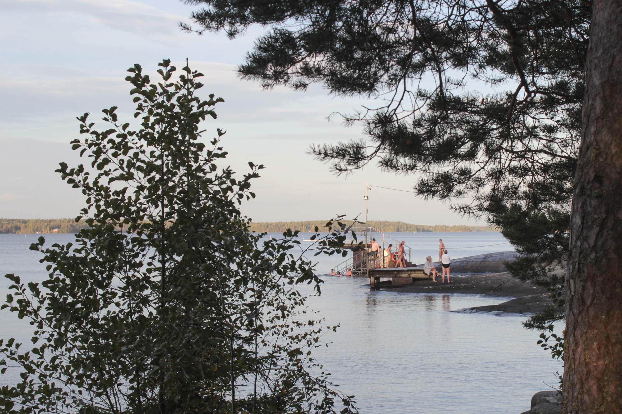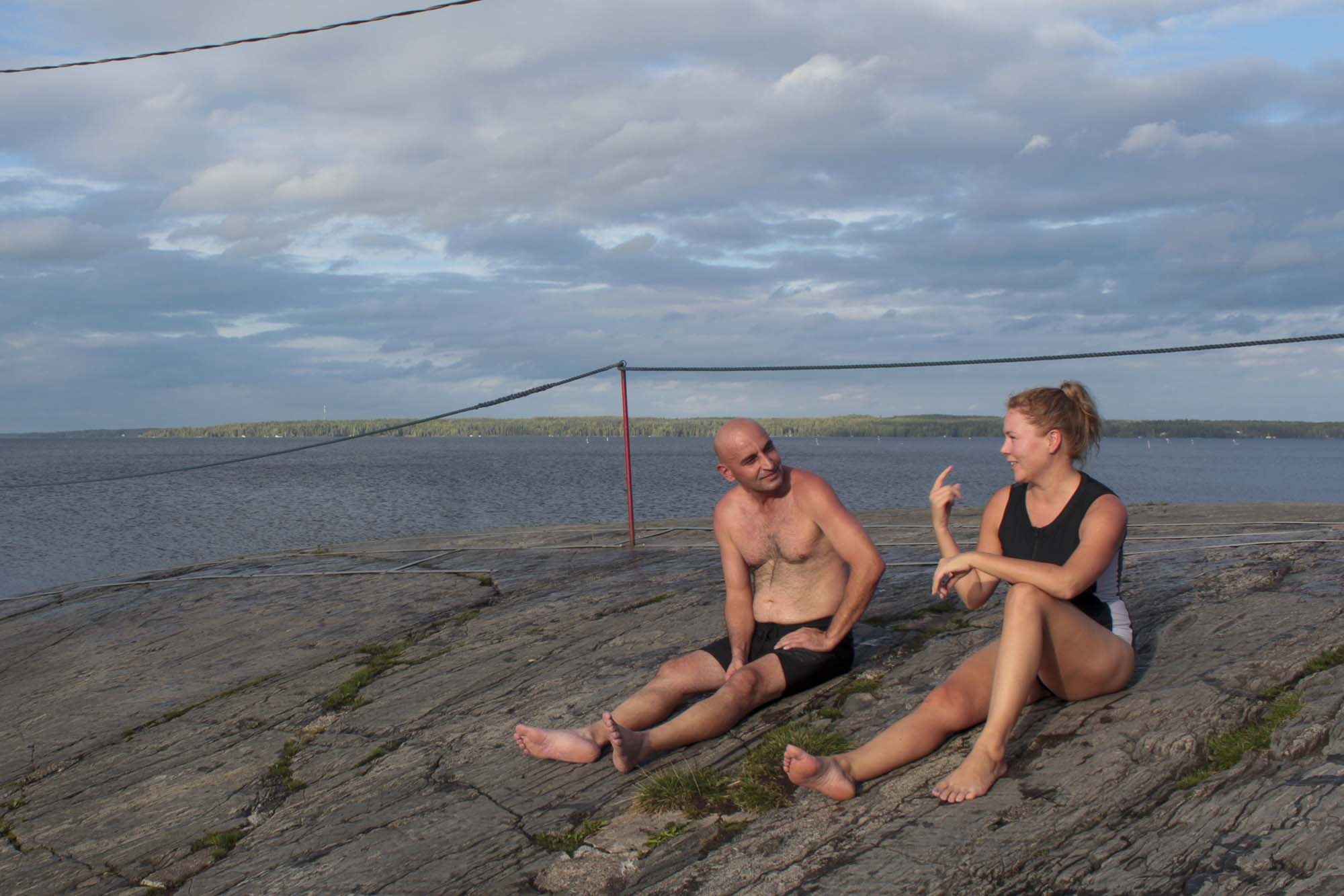 Koska niin monella on käynnissä oma keskustelunsa, tuntuu aluksi hankalalta hypätä niihin mukaan. Käytyäni uimassa ja istuessani saunan ulkopuolella sijaitsevalla penkillä kerään kuitenkin rohkeuteni ja kysyn vieressäni päivää paistattelevalta mieheltä, onko sauna aina yhtä täynnä.