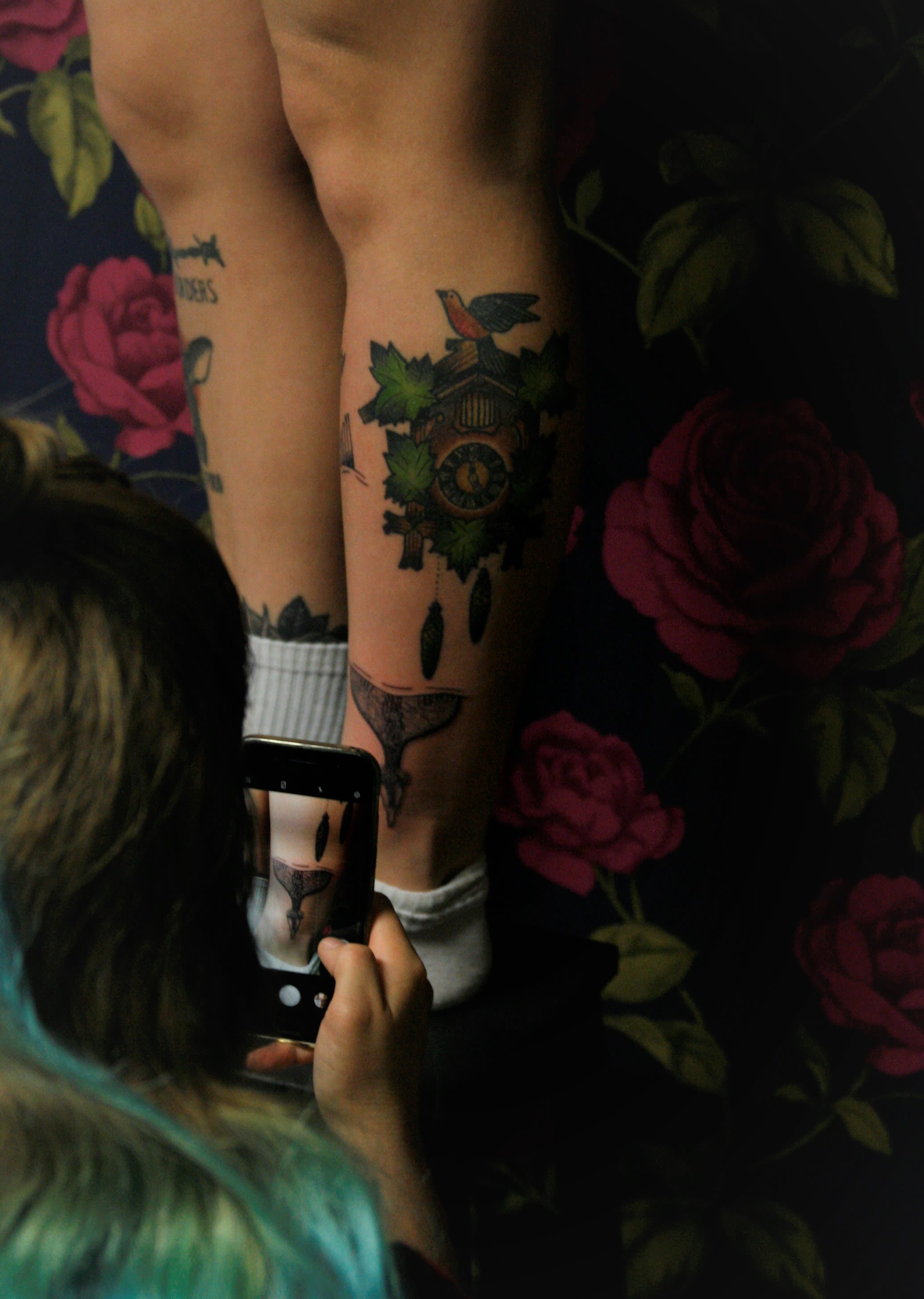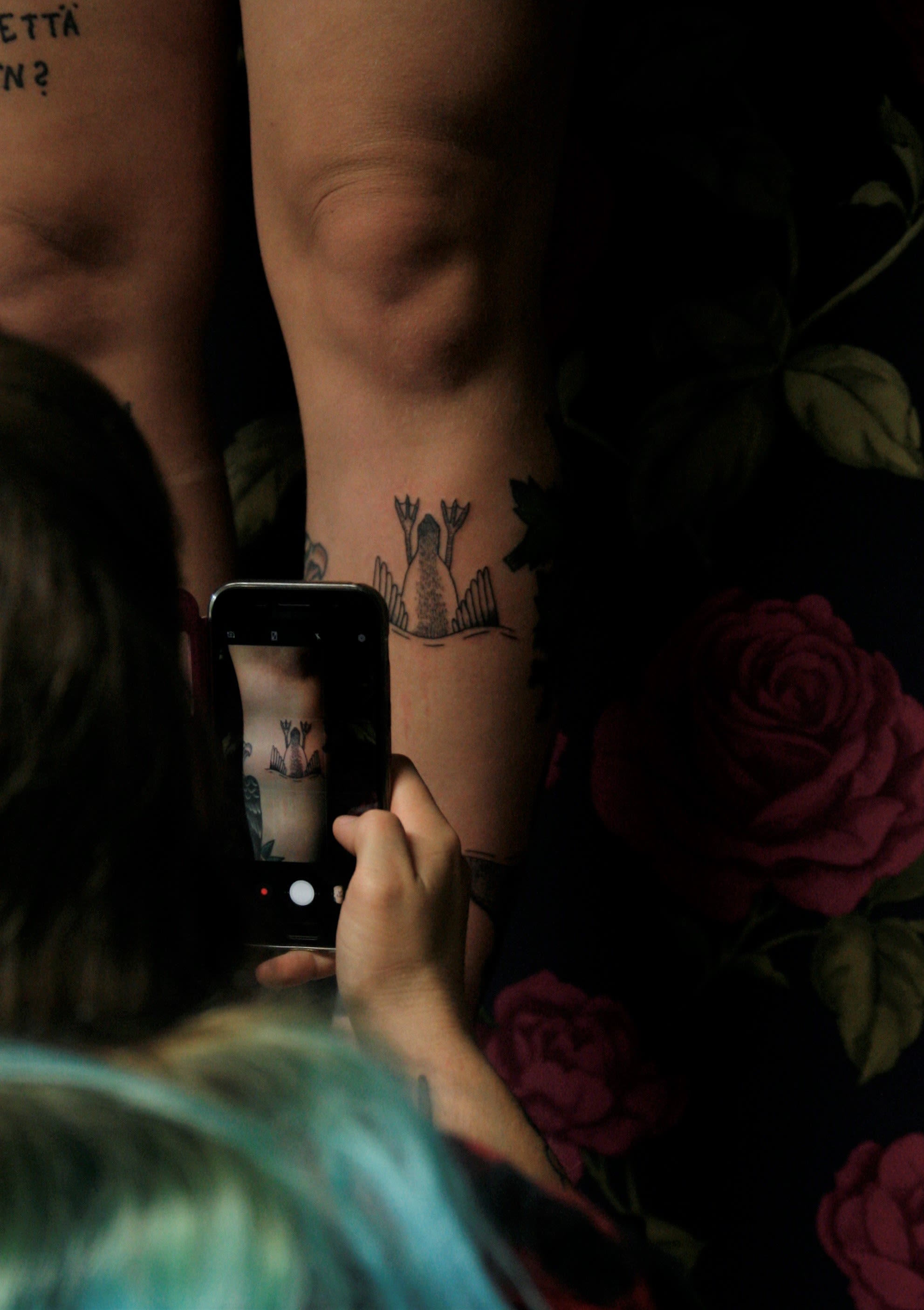 Ovi käy ja tatuointitaiteilijan ystävä Roosa Lappalainen astuu sisään studioon. Kahtia katkaistun vesilinnun asettelua aletaan pohtia. Päätetään, että olento saa uida keskisäärestä sisään ja nostaa päänsä pinnalle juuri ennen nilkkaa. Kuva on yksinkertainen viivapiirros, sellainen mitä täällä tehdään paljon.